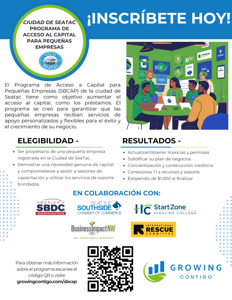 SeaTac Small Business Capital Access Program April 2, 2025 No Comments SeaTac business owners can access free coaching, financial guidance, and loan readiness support. Complete the initial steps to qualify for a $1,000 stipend while funds last! Read More »