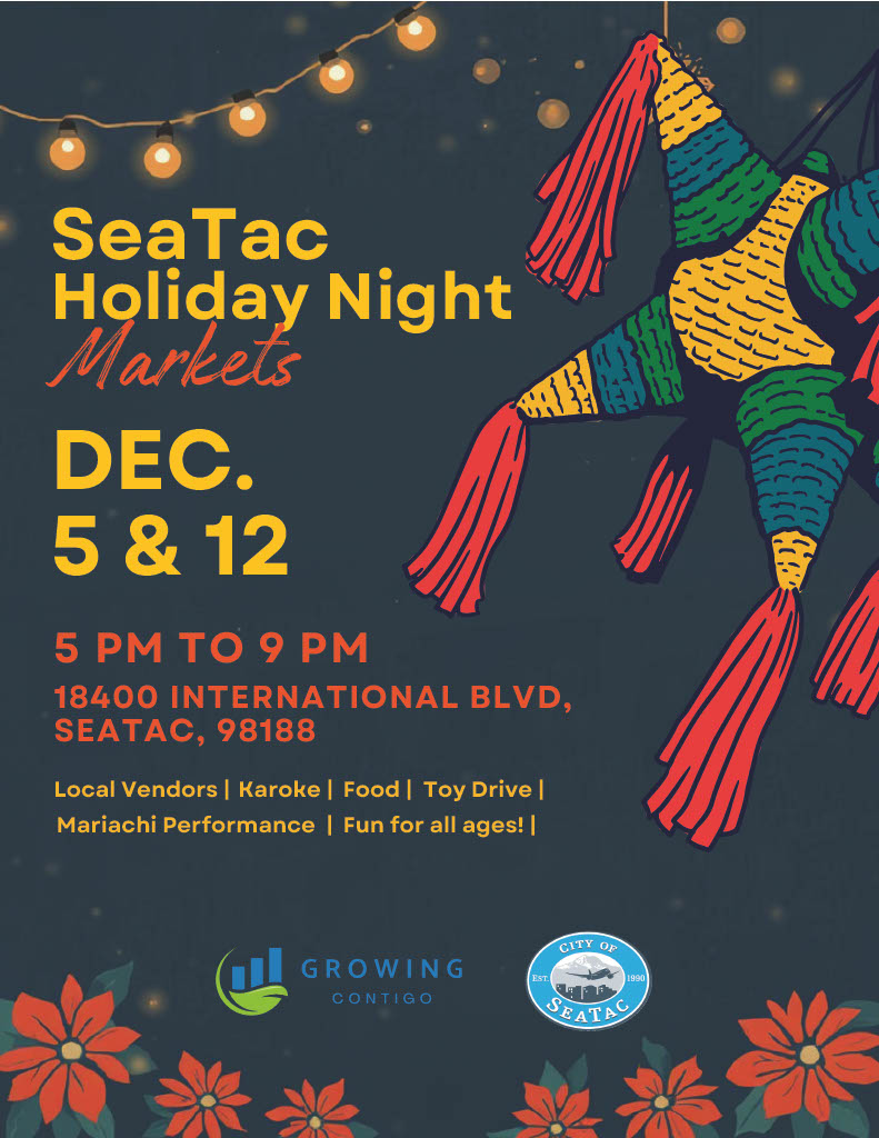 Get ready to experience the magic of the holidays at the 2025 SeaTac Holiday Night Markets! Join us for two festive evenings with local vendors, mariachi performances, delicious treats, a community toy drive, and community karaoke!